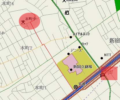 最寄駅の京王新線初台駅から練習場所の本町中学校までの簡単な地図を載せておきます。