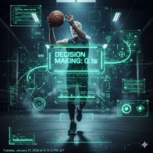 空間認識(頭頂葉フル稼働): コート上の10人の動き、ボールの位置、ゴールの距離を360度、瞬時に把握し続ける。